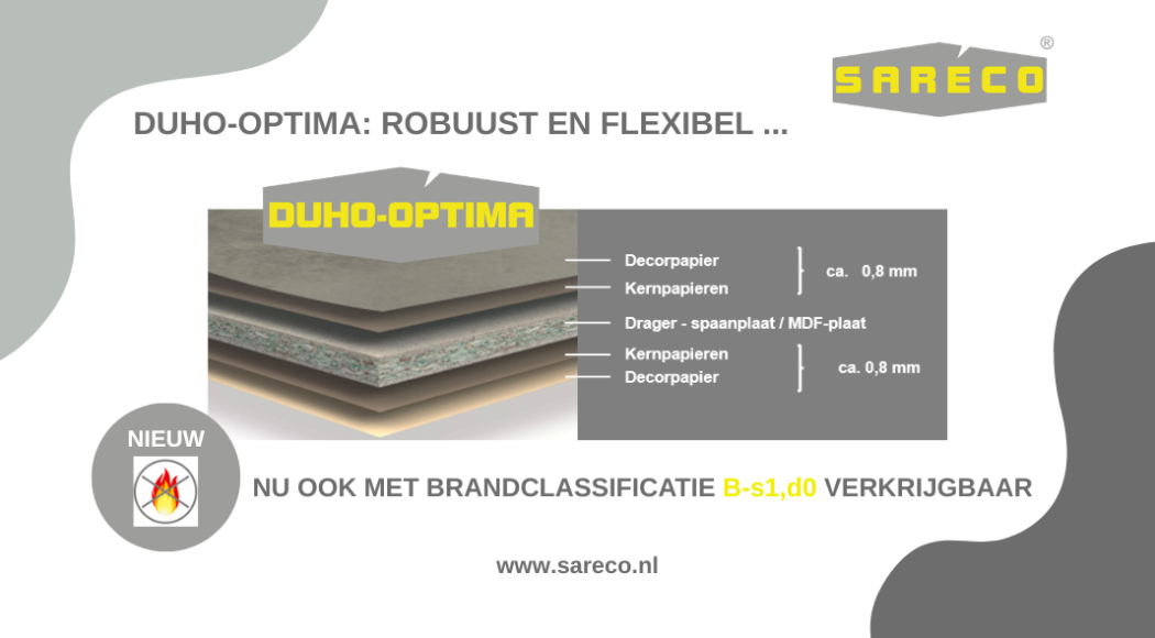 Onder de naam DUHO-OPTIMA FR SPAN is dit product nu ook verkrijgbaar in een brandvertragende uitvoering. Deze uitvoering, met een spaanplaat E1 P2 als drager is B-s1,d0 gecertificeerd volgens EN 13501-1:2018.